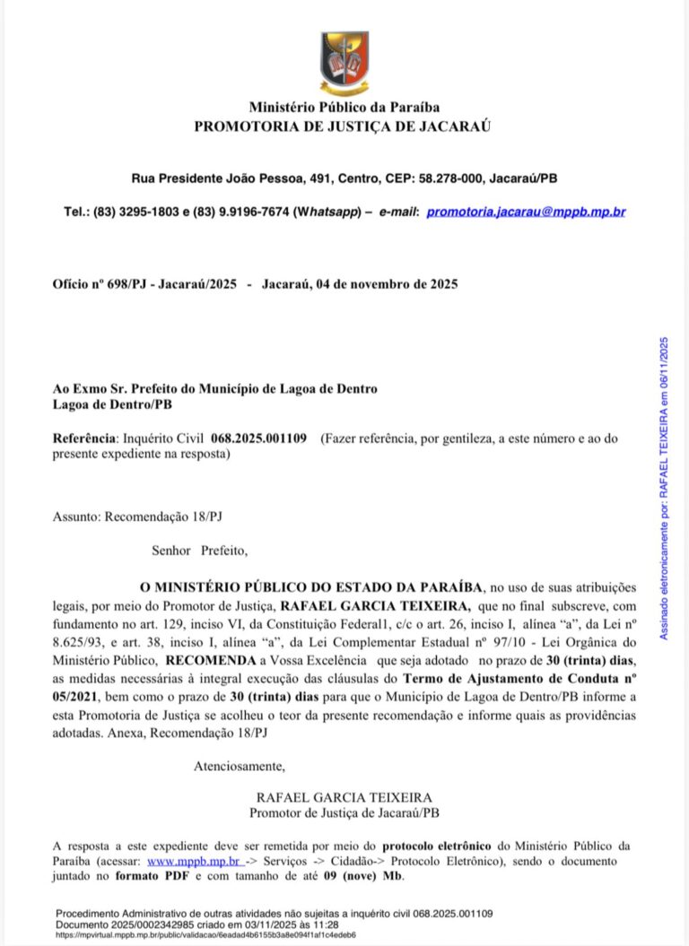 Promotoria obriga Município de Lagoa de Dentro a cumprir TAC sobre cobranças do IPTU firmado pela antiga gestão novembro 19, 2025 Leia Mais...