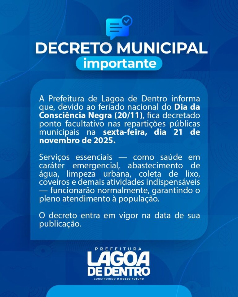 Prefeitura de Lagoa de Dentro decreta ponto facultativo no dia 21 de novembro novembro 19, 2025 Leia Mais...