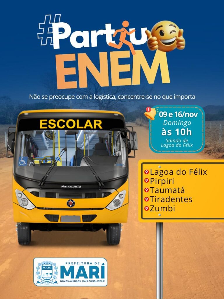 CODECOM | Prefeitura de Marí garante transporte gratuito para inscritos do Enem da zona rural; veja itinerário e horários novembro 8, 2025 Leia Mais...