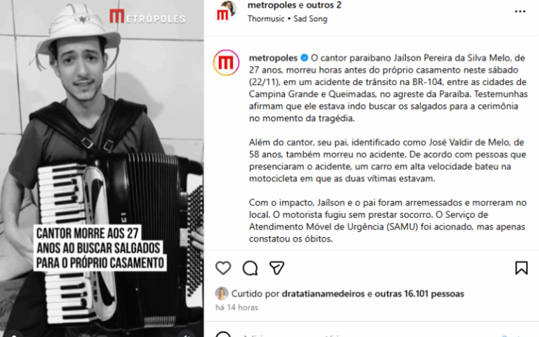 Morte de cantor paraibano no dia do próprio casamento repercute na mídia nacional novembro 24, 2025 Leia Mais...
