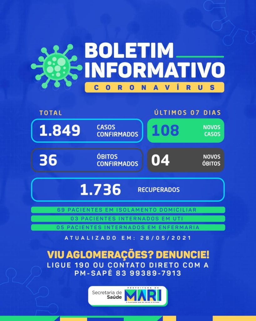 Nesta sexta (21) a secretaria de saúde de Mari emitiu boletim informativo Coronavírus, que retrata a situação dos últimos 7 dias. Foram 52 novos casos positivos e 1 óbito, 26 pacientes em isolamento domiciliar, 4 pacientes internados em enfermaria, e 5 pacientes internados em UTI. Foram ao todo 1741 casos confirmados com 1674 recuperados e […]
