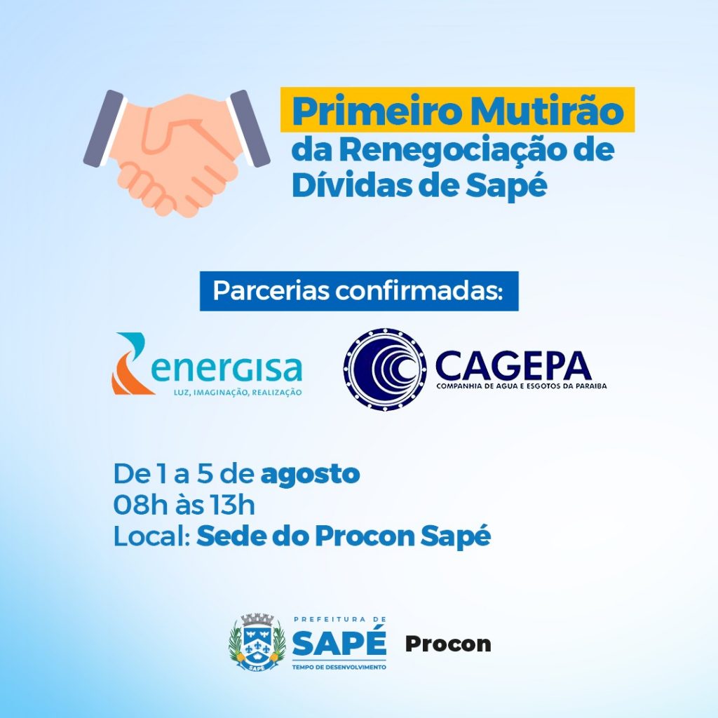 A Prefeitura de Sapé promoverá o Iº Mutirão de Renegociação de Dívidas da cidade. O Programa de Proteção e Defesa do Consumidor de Sapé (Procon) será responsável pela ação, que acontecerá entre os dias 1 a 4 de agosto. A atividade faz parte do cronograma de atividades do órgão municipal e irá contar com a […]